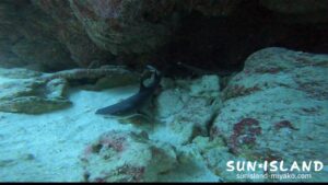 クマノミを通り過ぎると早速洞窟への入口が。人一人が入れるくらいのスペースを通って奥へ進んでいきます。洞窟の中には、赤くて目が大きなアカマツカサがたっくさん群れていて下から見上げると岩の間から見える光と相まってとても綺麗ですよ。更に奥へ進むと大きなホールが出てきて、宙に浮かびながら上を見るときれいな景色が広がっています。もっともっと光が差すとレーザービームが見れたりもするのでオススメですよ。