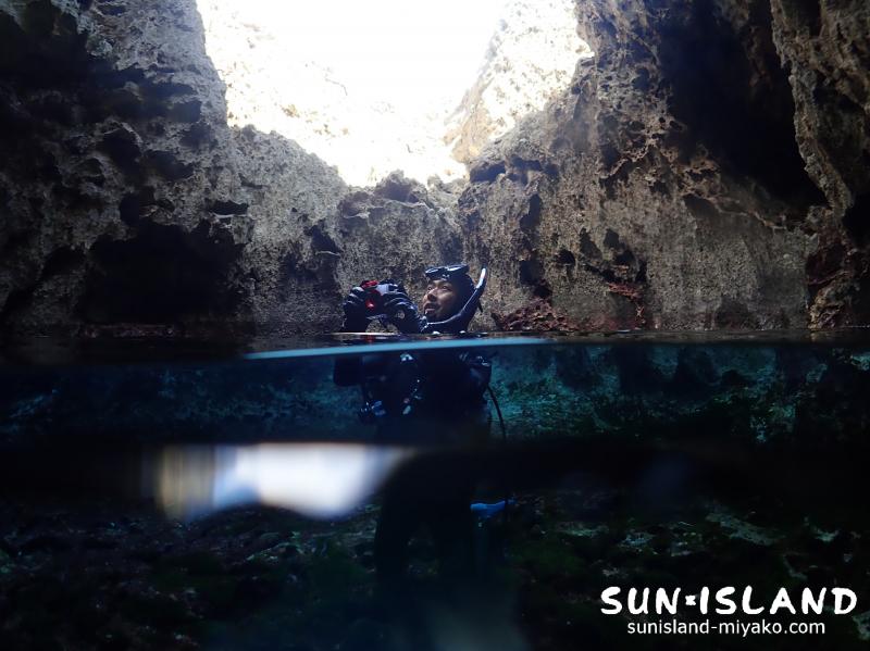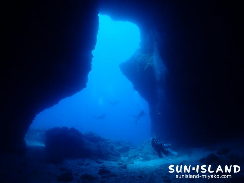 こんなに大きな穴の開口部から、海の青さが目に飛び込んでくるんです。写真の中のダイバーを見て頂くと、その大きさ、伝わりますか?