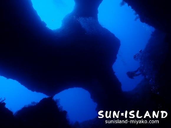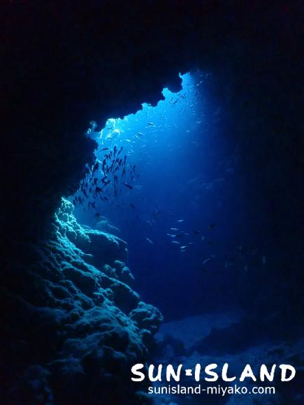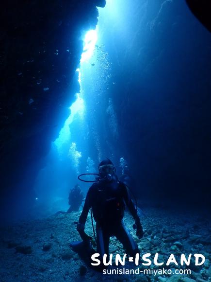 続いて2本目は、これまた宮古3大地形ポイントの一つでもある『魔王の宮殿』へ。時間帯的にもちょうど光が真っ直ぐ入って来るときだったので、光の筋とキラキラ輝く水底、いい感じに群れていてくれたハタンポ達、全てがきれいでした。Sさんも端から見上げたり、光の真下に入ったりと、色んな角度から楽しんでいましたよ。他のチームはカメを見たらしく、私達も見たかった・・(泣)