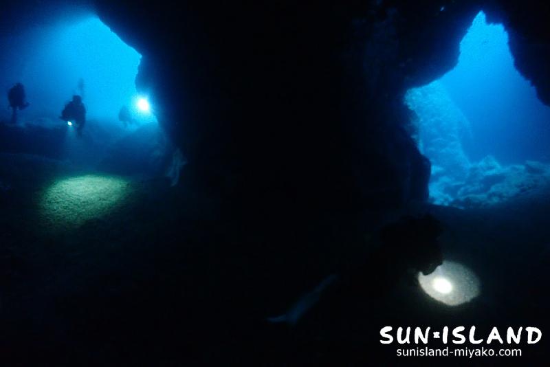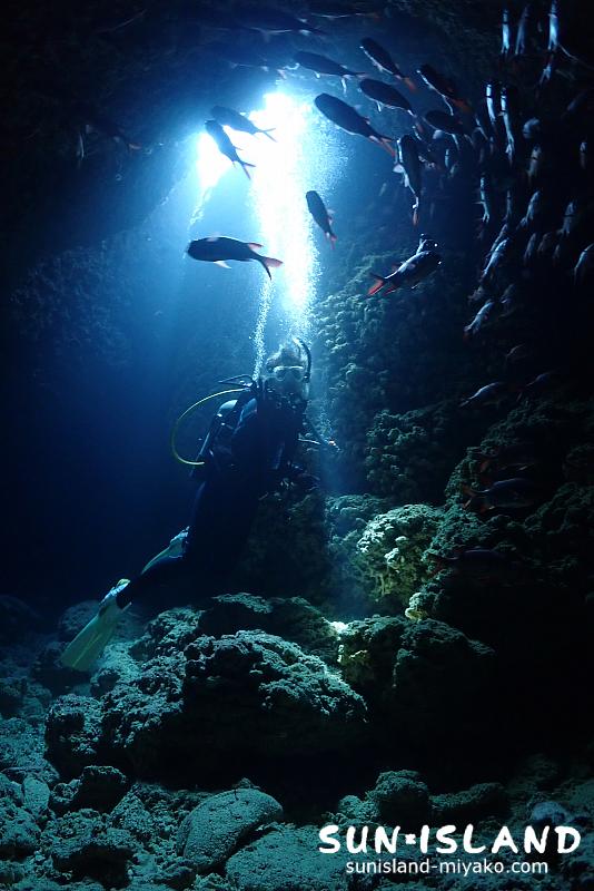 リュウグウウミウシやキスジカンテンウミウシ等の小さい生物をはじめ、洞窟によくいるアカマツカサやハタンポ、テンテンウミウシの交接シーン、イナズマのような光を放つウコンハネガイ等をじっくり観察。洞窟探検気分を味わえる宮古島ならではの地形もしっかり堪能。