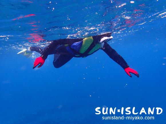さて今日の海ネタ。前述したとおり生憎の天気で、風も強く波も高かったので宮古島の南側にあるポイントへ。今日のような風向き、コンディションの日くらいしかいけない場所で、リピーターさんたちにとってもめったに行けないポイントなんです。そのポイントで今日はボート体験ダイビングに行ってきました!港である程度の説明をしたら早速船に乗り込みポイントへ移動。乗り合いのショップさんでファンダイビングの方がいらっしゃったので1本目入られている間にまずは水慣れのシュノーケリングに行きます。寒さをこらえながら着替えて水中へ。顔をつけた瞬間「わぁ~!凄い!綺麗!」とKさん。カラフルな魚たちに魅了されていました。