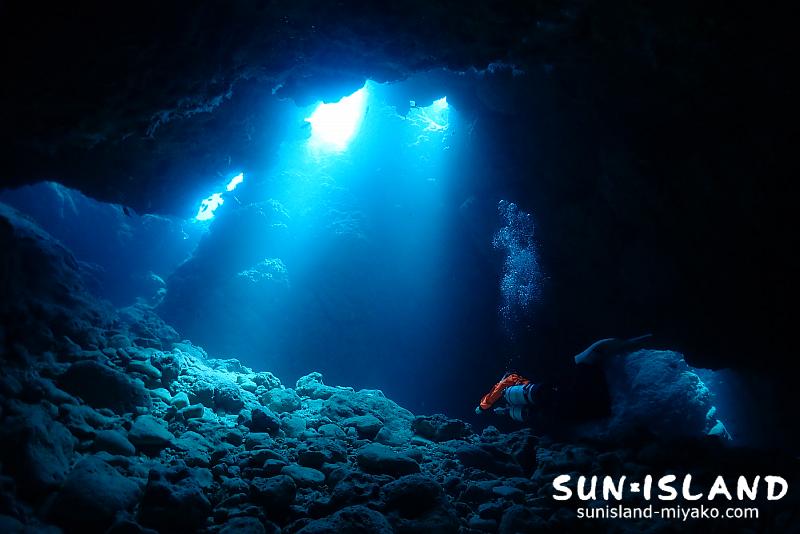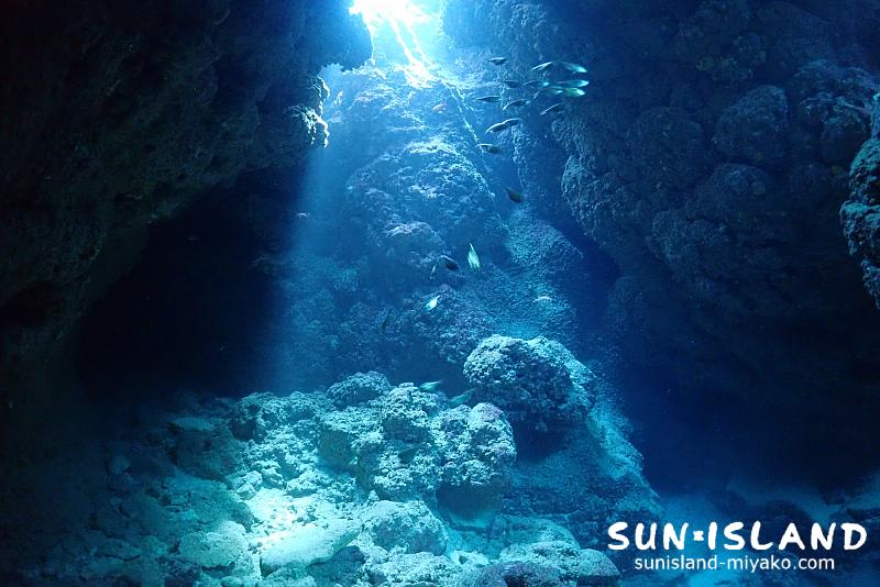 ブルースクリーンのコントラストがとても見応えあるポイントですが最大水深28mとディープダイビングになります。Yさんは洞窟入口の時点で耳抜きが上手くいかなかったので二手に分かれ、私たちは近くの『なるほどザ・ケーブ』のオマケでご案内することが多い、浅瀬の亀裂で遊びました。浅いからと言って侮れません、オマケと言いましたが浅いからこそダイレクトに差し込む日差しが綺麗なんですよ。