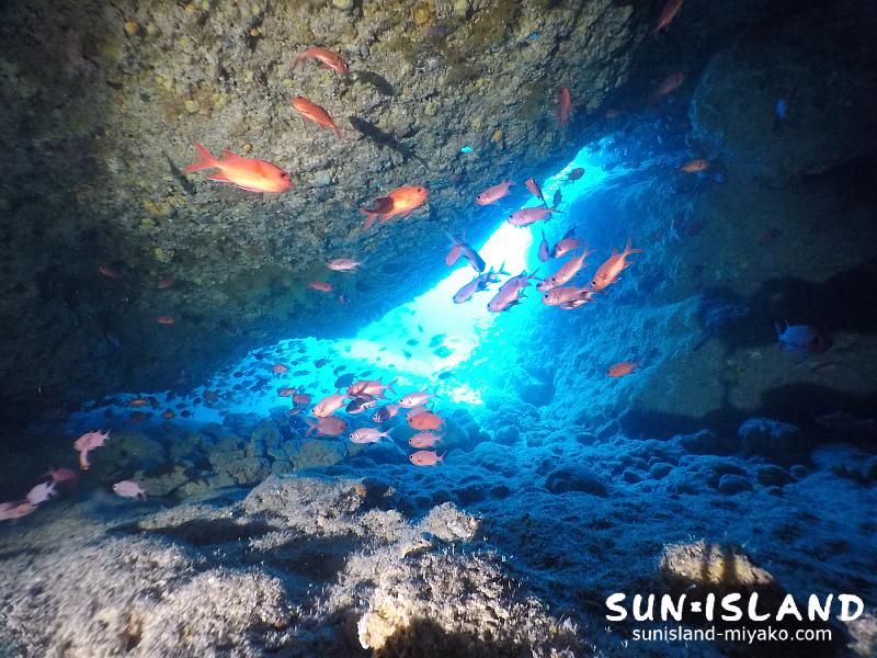 開口部からのブルースクリーンと背景の黒、そしてハタンポが宮古島ダイビングらしい風景をなす。