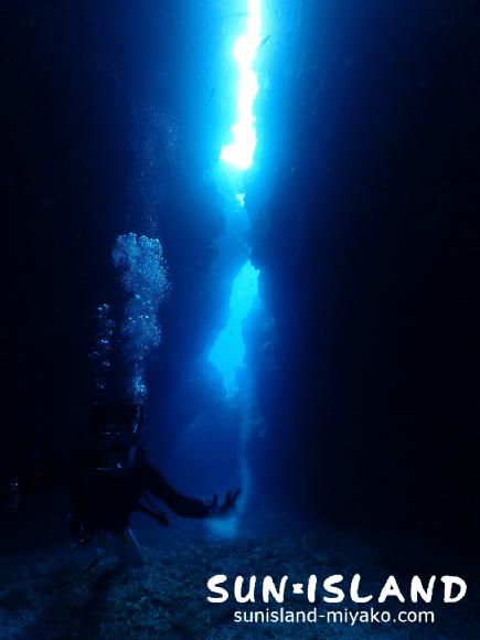 こんな感じ。海の青さの深みがまして、これはこれで幻想的な景色となります。洞窟の中にいるアカマツカサも私達のライトに驚いた様子で四方八方散らばって泳ぐ様もきれいです!!!魚影と青さのコントラストを撮るのもオススメですよ。