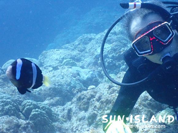 ケーブの出入り口には沖縄では珍しい黒いクマノミが。Uさんがちょうど顔を寄せていたのでこっちむいてー!と合図を送り、1枚パシャリ。可愛い写真が撮れました。