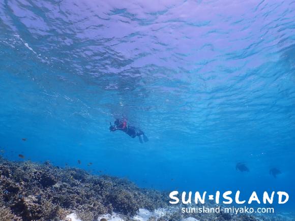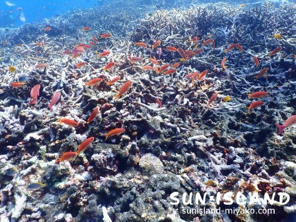そして八重干瀬ツアーもラスト3本目。サンゴの綺麗な『コーラルウェーブ』へ。ここ数年台風があまり来ず、その影響などで宮古島全体のサンゴが壊滅的状況だったのですが、このポイントはわずかですが復活していてとても綺麗でした。イソバナもたくさんあって写真映えするポイントですよ!シュノーケリングで来ているショップさんも数件あってみんな満喫していました。ハナダイ科の魚達の群れがすごくきれいで、ここに住みたい!なんて思っちゃいました。笑