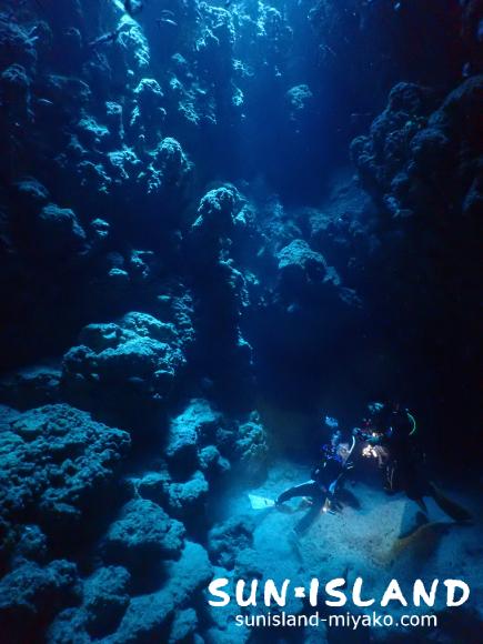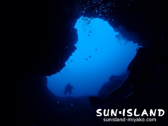 1本目は『女王の部屋』と『なるほどザ・ケーブ』に分かれてご案内しました。まだ1本目は雲が多く光が全然入らなかったため薄暗い中でのダイビングでしたが、それはそれで探検・冒険チックな感じで楽しかったですよ。女王の部屋へは10メートルくらいから一気に30メートル近くまで落とすのですが、穴に吸い込まれていく感じがなんとも言えません。振り返って自分のおりてきた穴を見るのも青みが綺麗でいいですよ!
