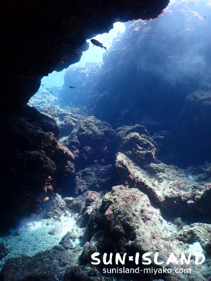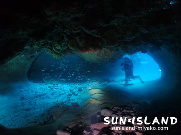 続いて2本目は『なるほど・ザ・ケーブ』。くねくねした洞窟を道なりに進んでいくと、あら不思議。入ってきた所へ出てきます。グルっと1周できるようになっていて、出てきときには「なるほど(ここに出るのね)。」と皆さん口にするのではないでしょうか。ところどころ空いた天井からの光もこのポイントの魅力なので、潜ったときには色々な角度から楽しんでみてください。今日はもう一つ。メインのケーブの横にある溝にも行きました。そっちのほうが明るく、最後の方には太陽も出てきてくれたのでキラキラな光のシャワーを見ることが出来ました。陸上は温かいとはいえ水中は24℃、23℃と冷たくて、30分を超えて入っていると震えてきます。明日はどうかな?