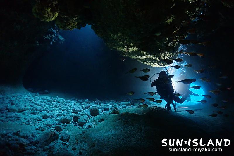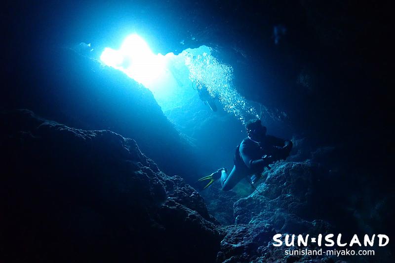 体験ダイビングチームとファンダイビングは3チームに分かれてそれぞれ『なるほどザ・ケーブ』『35ホール』『中の島チャネル』『ムーンライトホール』『アントニ・ガウディ』『魔王の宮殿』『ミニ通り池』へご案内。どのチームもひたすら洞窟、地形三昧の3ダイブ。どれも1度潜ったらハマっちゃうような、宮古島らしい地形ポイントばかり。
