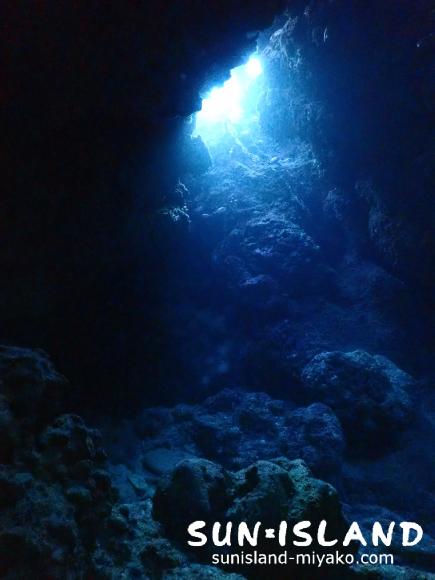 まず1本目は宮古三大地形ポイントの1つ、『アントニ・ガウディ』。最大水深35メートル~40メートルほどにある地形がメインのスポットになっていて、いくつか空いた穴がおりなす地形の造形美はとても素晴らしいです。見る角度によっても見え方が違うし、ワイドレンズなしではカメラに収まりきらない程の大きさにはいつも圧倒されます。