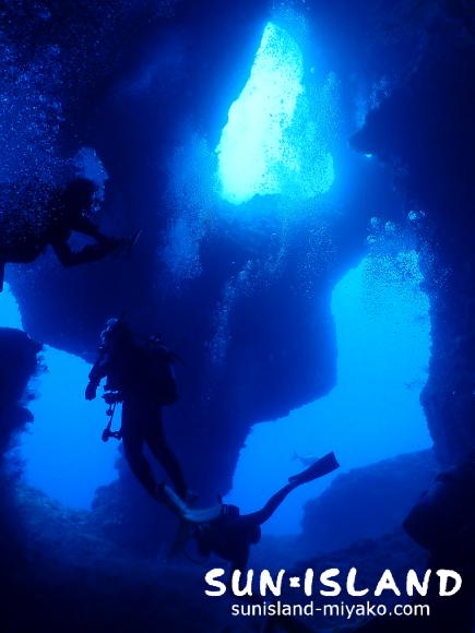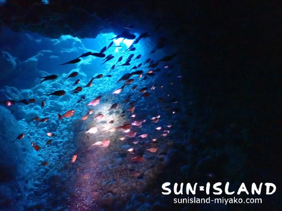 そしてラスト3本目は『ツインケーブ』。ここは他の2つのポイントと違って少し透明度は良くありませんでしたが、ケーブの中にはハタンポやアカマツカサがたくさんで、出口の青と魚の影のコントラストが綺麗でした。