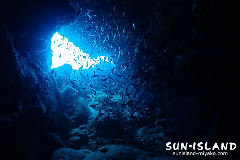 岸側に出入り口となる1つ。ホールの真ん中に吹き抜けの大きな天窓が1つ。沖側に小窓が3つ。計5つの窓から差し込む海の青、背景の黒、砂地の白のコントラストが、透明度が良い分今日は一段と綺麗に感じました。