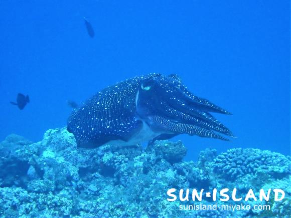 ウミウシなどを探しながらポイントを周り、棚の上へ行くと大き大きなイカが!!!
