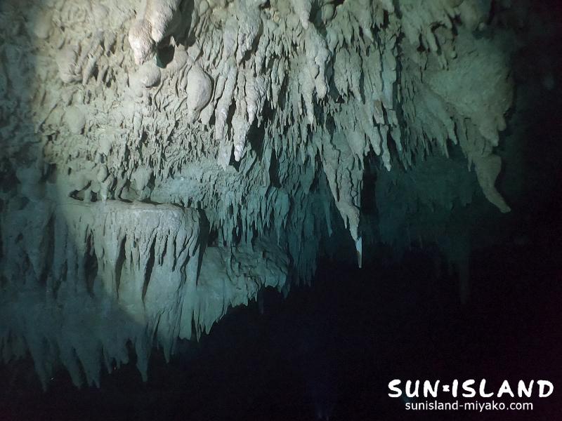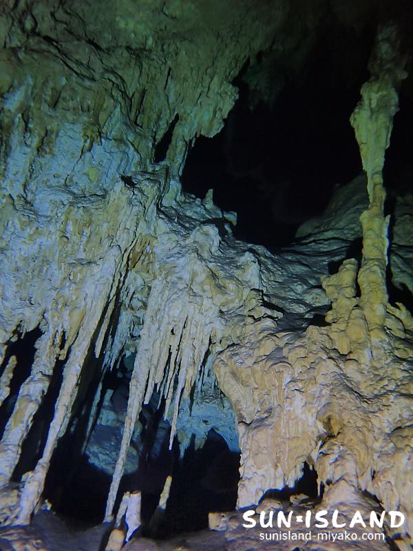 水中ライトの灯りを頼りに進んでゆくと、こんな立派な鍾乳石があちらこちらで目に入ります。