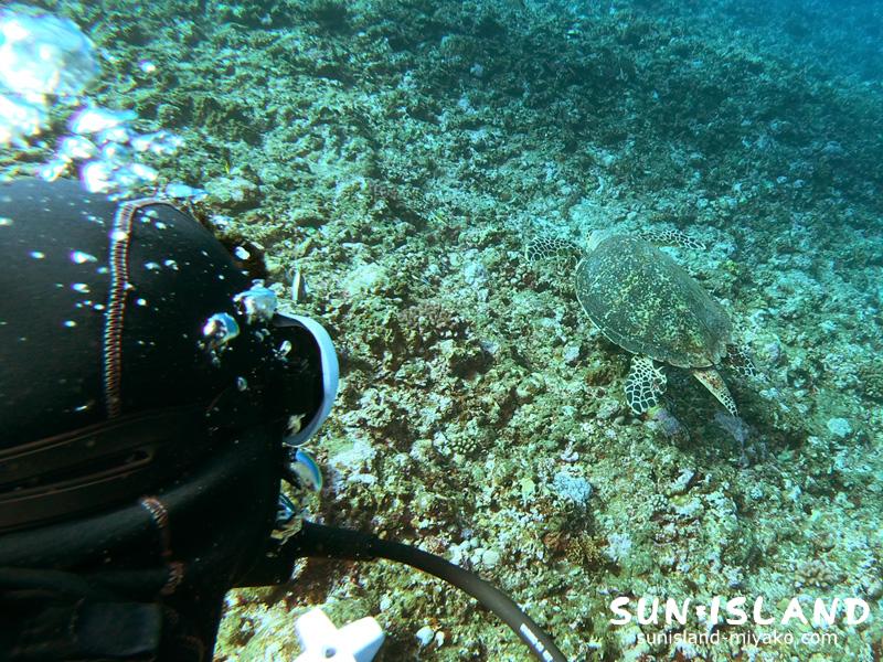 潜り初めたその瞬間、水底になんとカメ(タイマイ)がいました!!