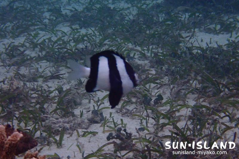 主に暖かい海の珊瑚礁や岩礁を住処とし、多くが小型で体の形は丸くカラフルな魚が多いのが特徴なスズメダイの仲間より「ミスジリュウキュウスズメダイ」。白地に3本の黒いラインの模様まで分かりやすく撮影できているので、似ている「フタスジリュウキュウスズメダイ」や「ヨスジリュウキュウスズメダイ」と見分け、名前を判別することが出来ましたね~。