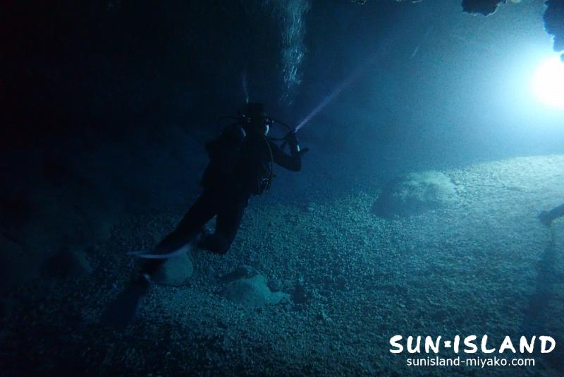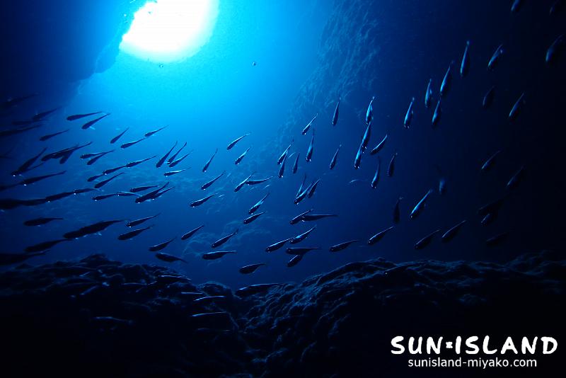 スリリングな高さ20m強の竪穴を降り振り返ると、入ってきた穴の開口部をバックにハタンポの群れが優雅に泳いでいます。開口部からの海の青みが、ハタンポのガラス玉みたいな瞳にキラッと透けているのが綺麗で個人的にはうっとりポイントでした。