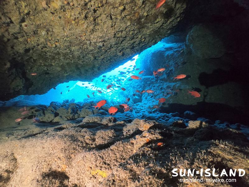 真っ暗な洞窟がメインでもあるこのダイビングスポット・ポイントは、全長20mほどの洞窟を進んでゆくので、ご案内は中級者以上の方のみになります。予めご了承ください。