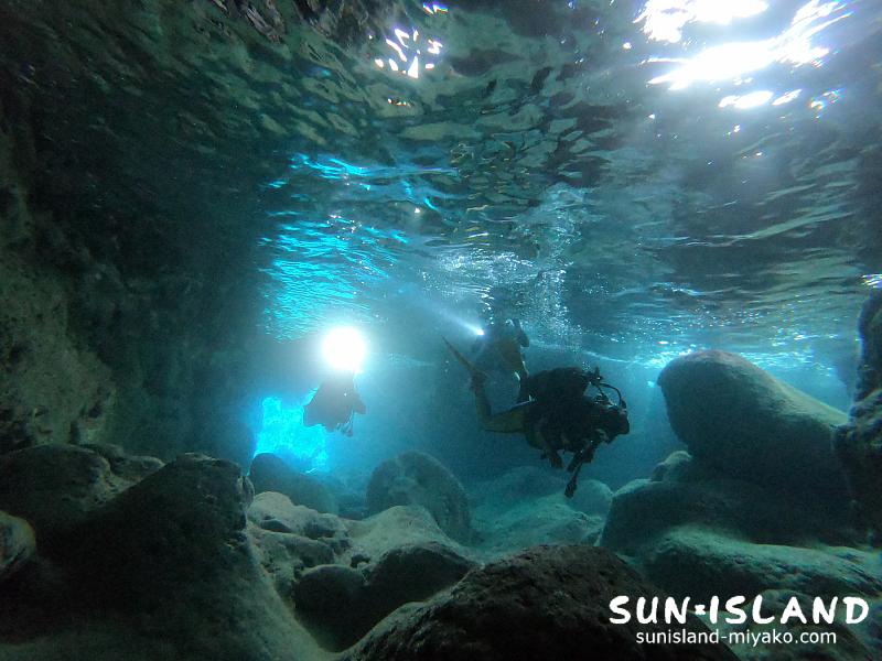 干潮時に潜り始めたので『青の洞窟』と呼ばれてるメインのホールの中は水深1.5mほどと浅く、やや浮き気味の方もいらっしゃいましたが、この景色をしっかりご覧いただきました。