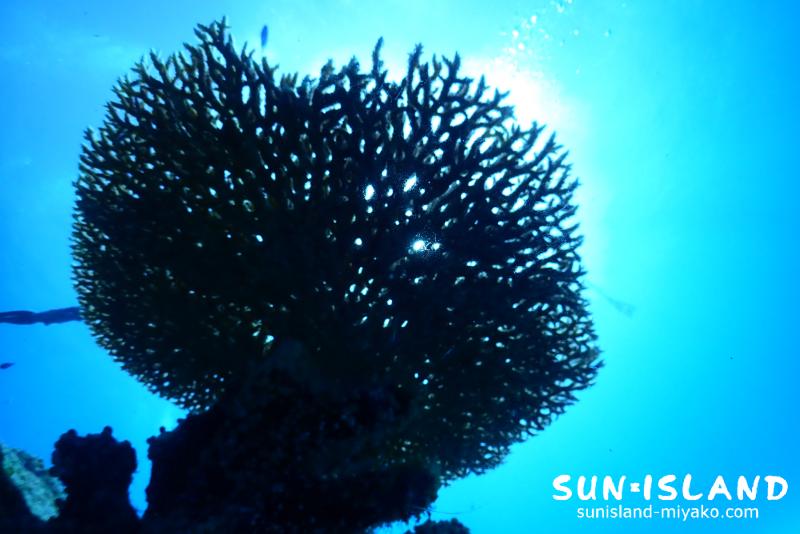 下から見上げると木漏れ日にうっとり出来ちゃう程大きなテーブルサンゴ。伊良部島・下地島エリアでは残念ながら数はかなり少ないです。