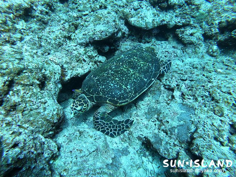 午前中のダイビングスポット・ポイントの最大水深が深かったので、ここでは最大14mほどの浅瀬を泳いでいると、窪みにうずくまるカメを発見。