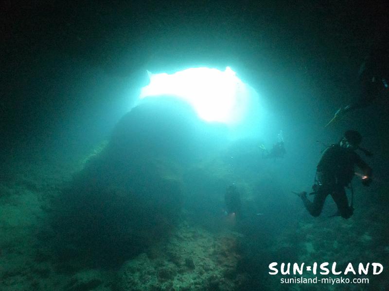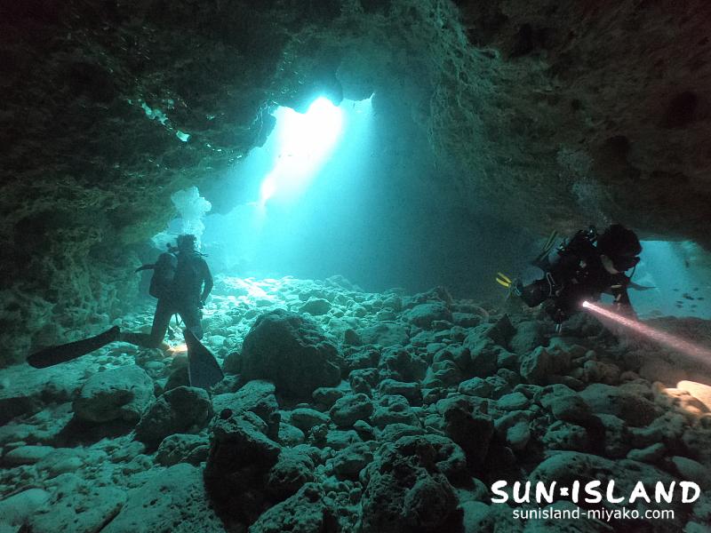 全長約30mほど続く洞窟は、下地島の中にある池につながっており、一度水面に浮上できる。