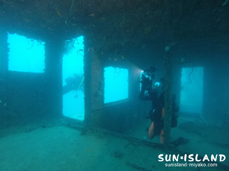 常時濁りやすく船内は薄暗い雰囲気が漂っていますが、ライトを照らしながら散策すると壁面に群れるキンギョハナダイが華やか。こんなところでびっくりなロウニンアジとの遭遇もありました。