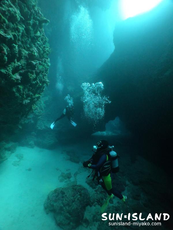 この洞窟内には、他の宮古島ダイビングスポッチト・ポイントに比べ、魚の数がとても多いのが特徴です。
