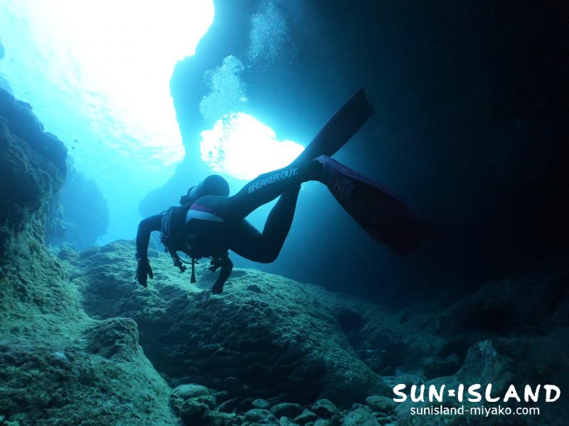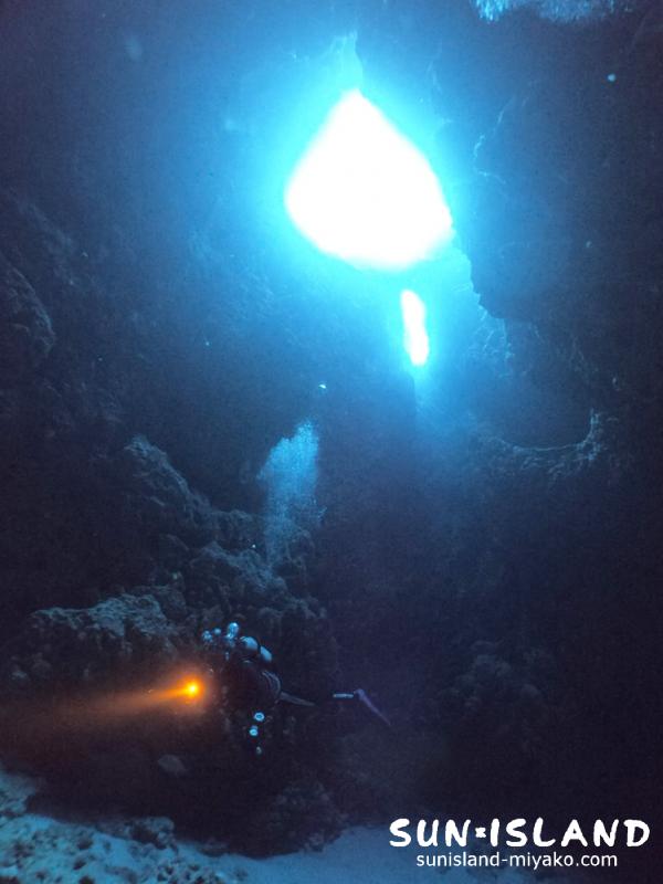 穴から光がサンサンと降り注ぎ宮古島ダイビングらしい景色。