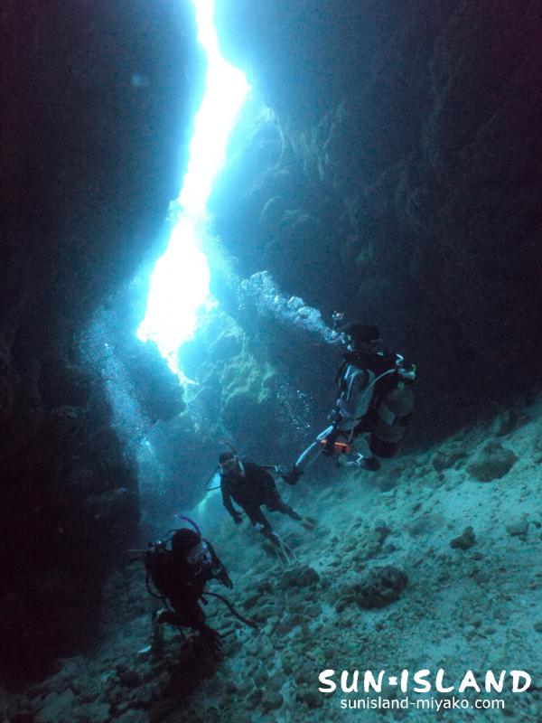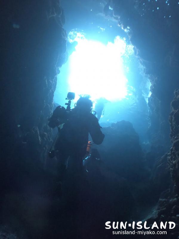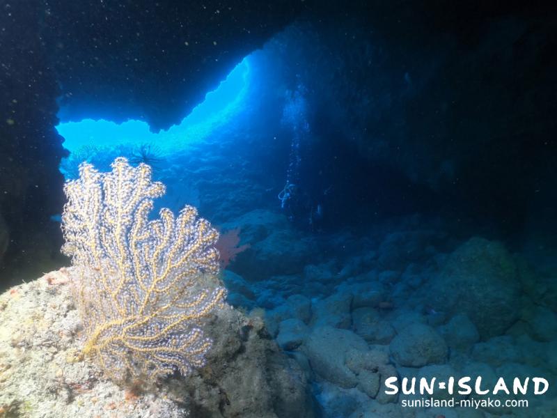 真っ暗な洞窟を進んだ先に見える海の青さが美しさを感じたりと、地形ダイビングならではの体験が得られます。まだ、地形ダイビングをされた事がない方、ダイビングを初めてまだ間もない初心者やブランクがある方でも安心して宮古島らしい起伏に富むダイビングスポットをご案内しておりますので、ぜひ遊びにいらしてくださいね。