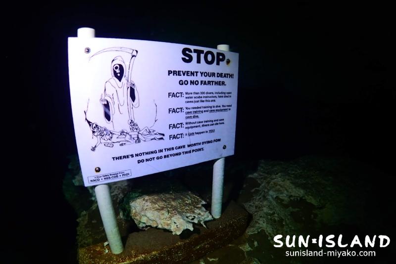 この看板の先は危険度が増すため、特別な知識とトレーニングを終了した人に与えられる資格を持つ、ケーブダイバーのみが侵入できます。いかにも、危険そうなドクロマーク・・