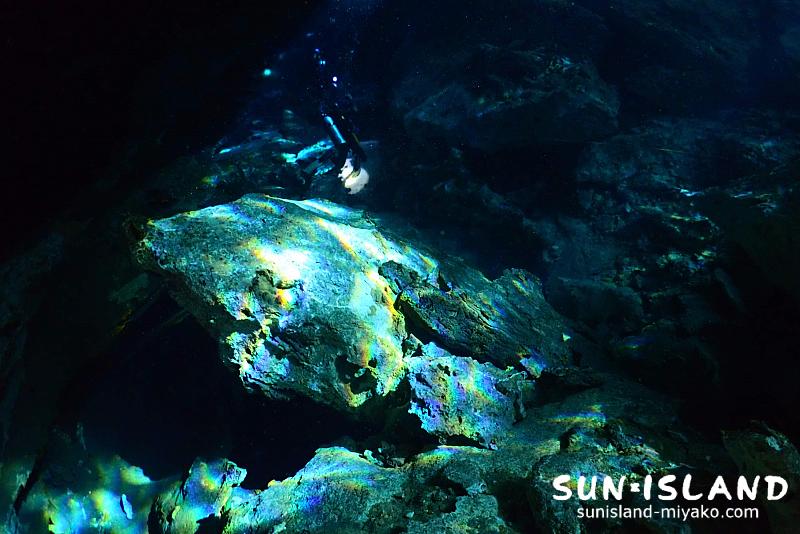 光のプリズムで虹色に映し出される水底の岩。こんな嬉しい幸せがあちこちに散りばめられているポイントは正に楽園。究極の癒しセノーテ・エデンでした。
