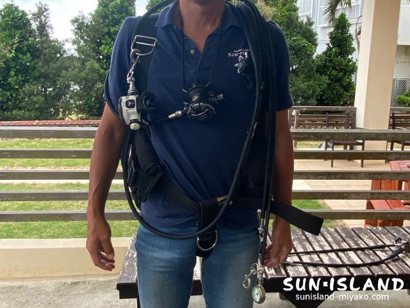 背中にシリンダーを2本背負うバックマウントやサイドマウントは、バックアップ空気源に使用するホース長は210cmもあるんです。