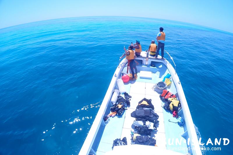 宮古島の北側、池間島を越えてぐるっと。ポイントまでの道中はブルーのグラデーションに囲まれる1時間程のクルージングを楽しみ、目的地に近づくと私たちからインフォメーションをします。この時点でお手洗いやスーツ、ブーツウエイトの着用、マスクの曇り止め等出来るところまで準備をお済ませ下さい。但し船は走行中のため無理の無い範囲で、揺れや急な減速に十分注意しましょう。