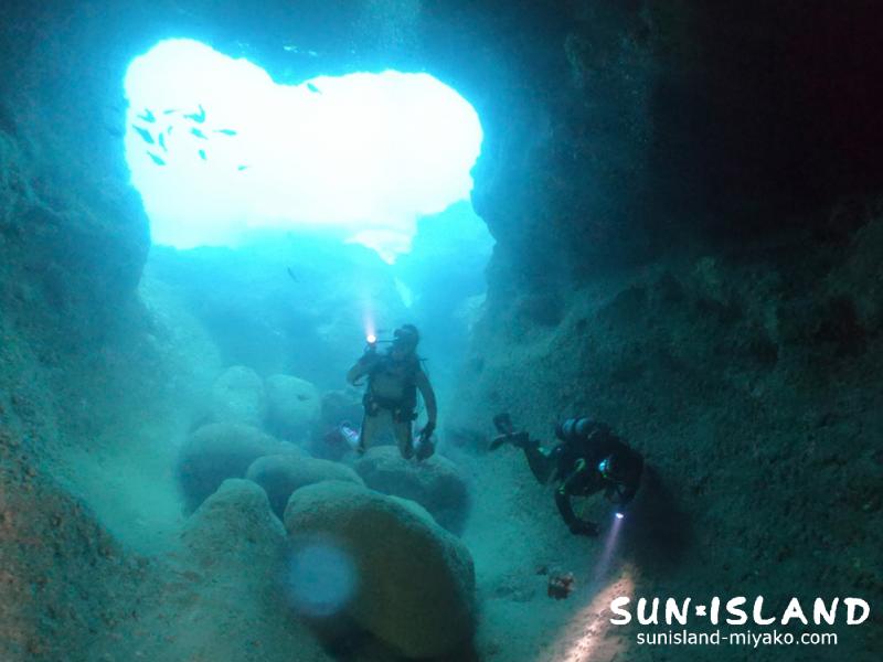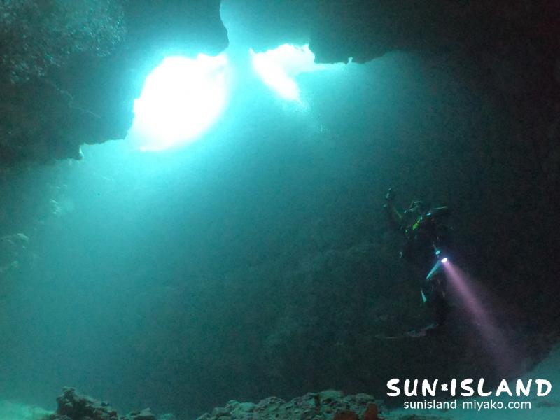 奥行き15mほどあり、つきあたりから水面に浮上すると、高さ10m・幅6mほどの空間(エアドーム)になっており、出入口からの青さが際立つ。