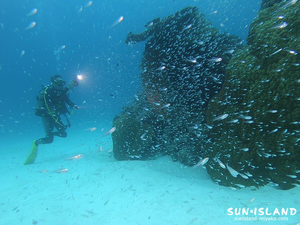船上では、時に肌寒さを感じる事もありますが、防寒対策を行い透視度30mオーバーの宮古ブルーのなか、起伏に富むダイナミックな地形ダイビングをぜひお楽しみください。