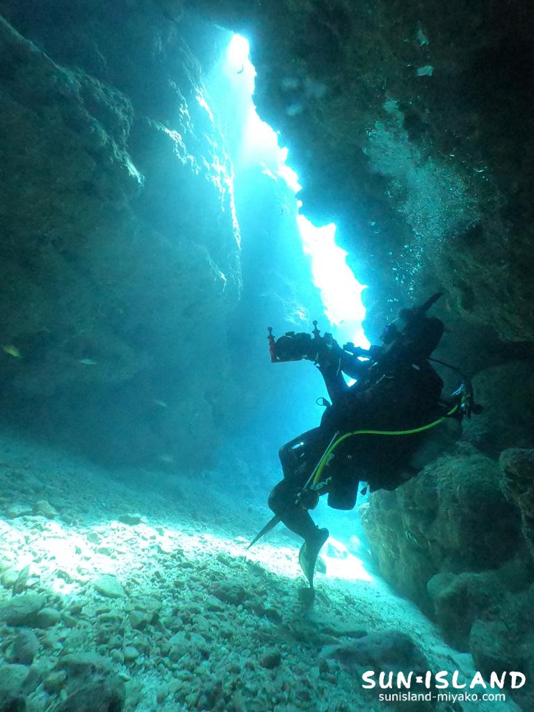 最大水深15mほどの宮古島ダイビングスポットの中では、比較的浅く主に3ダイブ目に潜ることが多いですが、朝一番だと池からの光のシャワーが見どころなんです!!