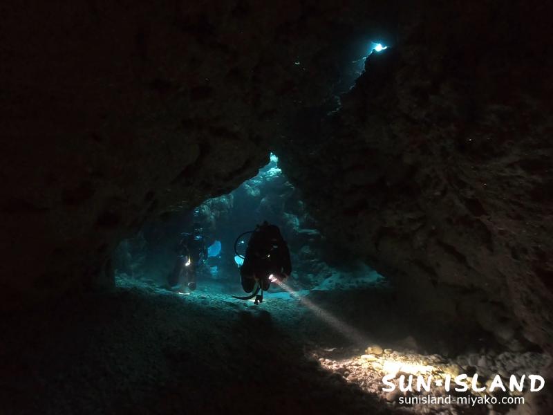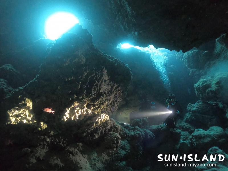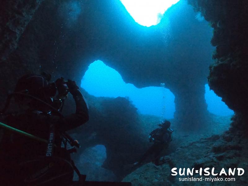 宮古島ダイビングポイントの中では1番メインスポットに対して空いている開口部の数が多く、それぞれが不規則な形をしています。皆さん色々な立ち位置や角度から、その自然が織りなす造形美をしっかり堪能されていました。