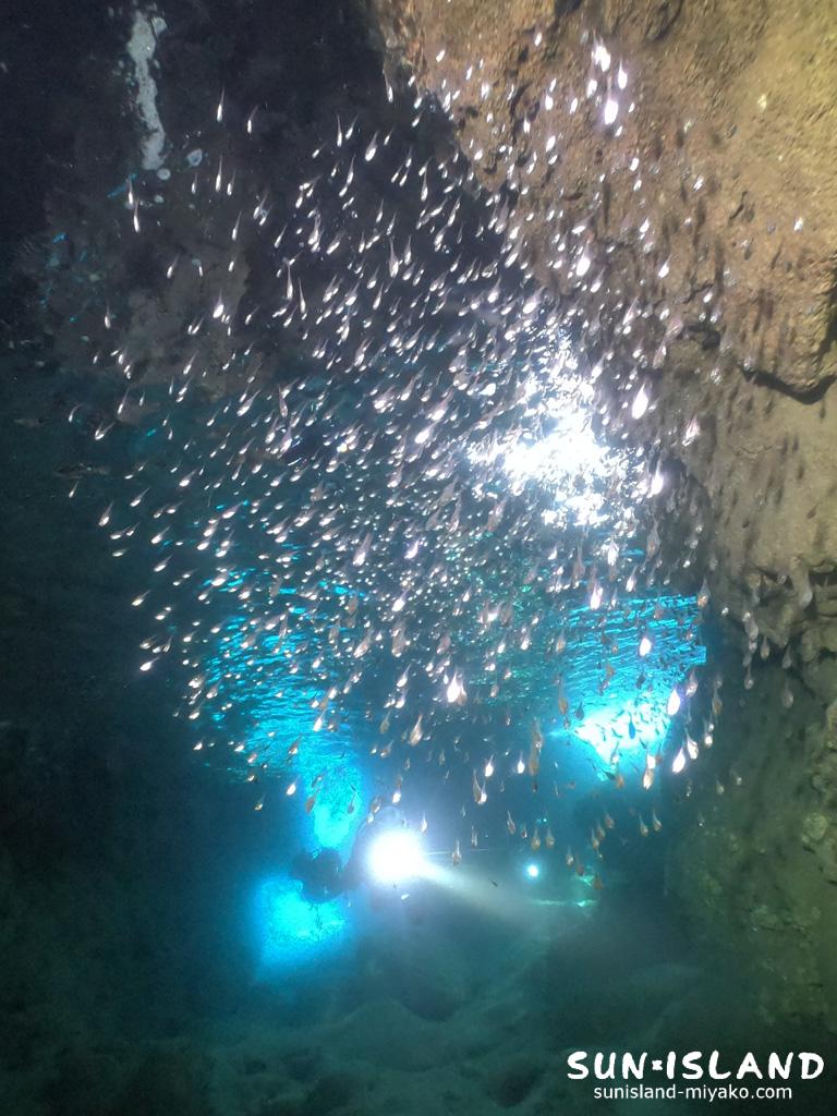 魚たちに光をあてると、一つにまとまっていた群れが弾け動き回り、キラキラ輝く様がまるで星空のようだった。