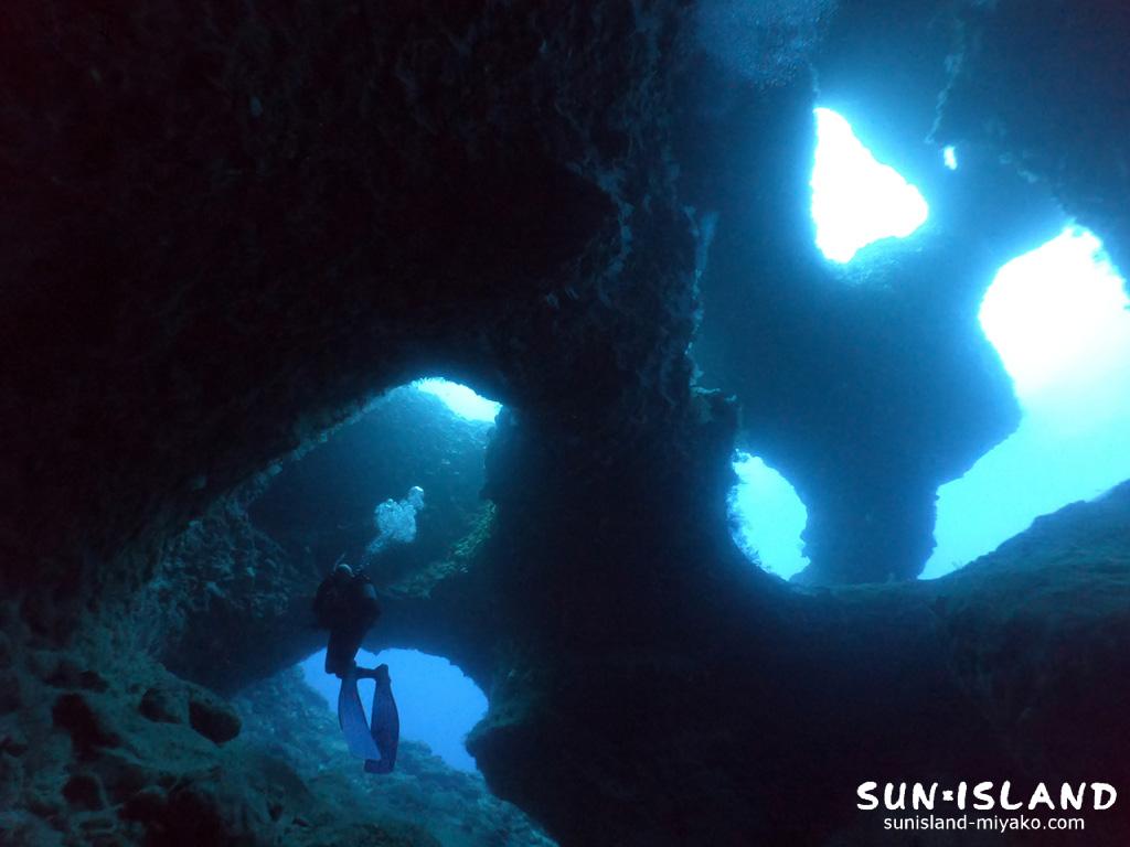 緩やかな流れに逆らい、沖にある直径20mほどのホールへゆくと、ほんと自然にできたとは思えないほど、美しい穴の造形美が広がってる。