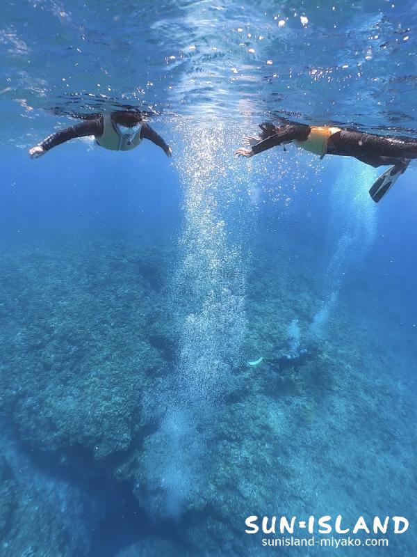 洞窟内でファンダイバーが吐いたエアに、包まれるのにハマった大学メンバーでご参加された今日の皆さん。シュノーケリング中は終始このポジションです(笑)