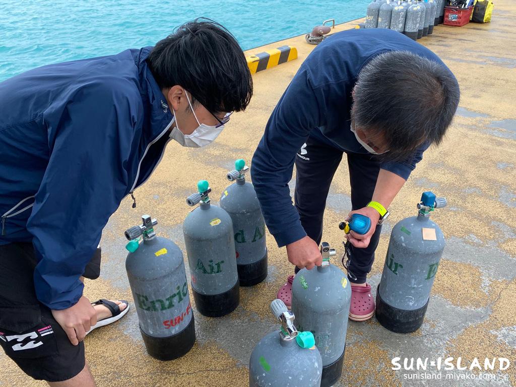 事前にオンラインにて学科受講され、実習ではエンリッチドエアでのダイビングをするにあたり酸素測定器(アナライザー)で酸素分圧の測定やダイブコンピューターの設定をダイビング前に行います。