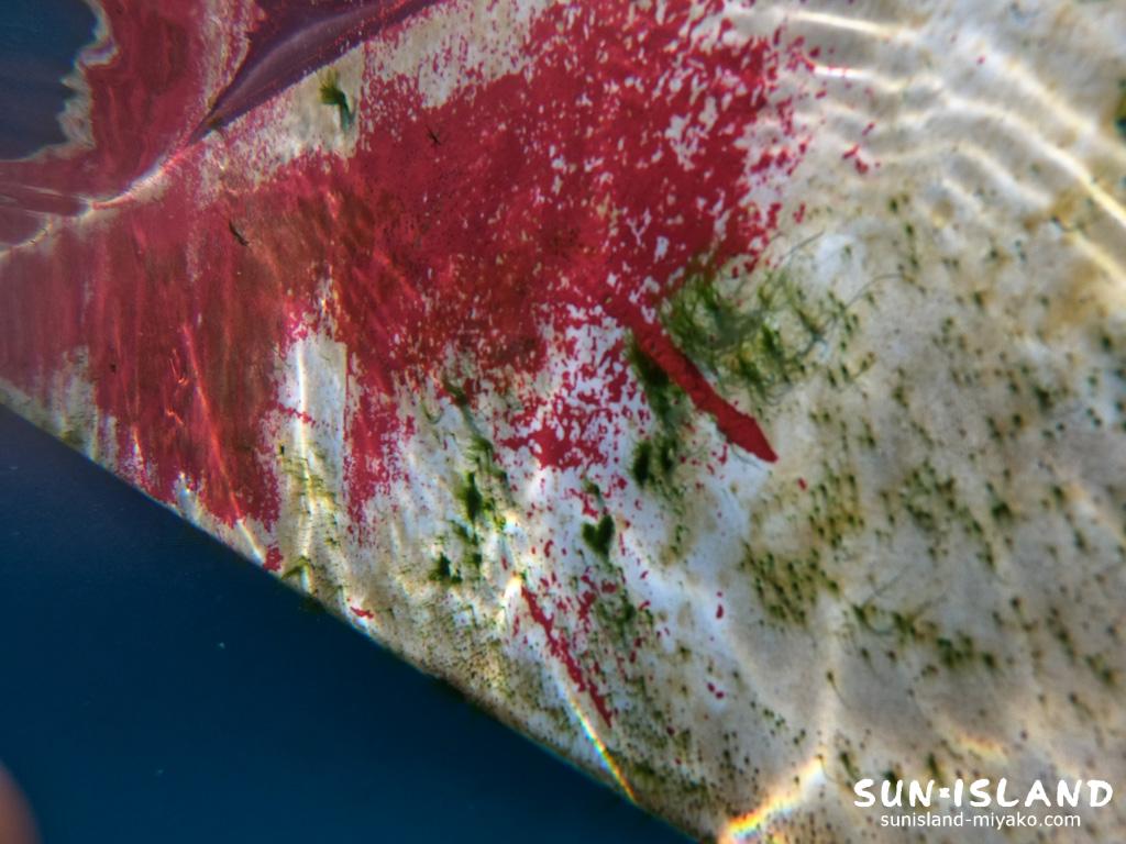 船底にフジツボや藻が付着しないよう船底塗料をシーズン入る前に塗るのですが、その効果は約半年~10ヶ月ほど。シーズンも後半になる頃には塗料が剥がれそこにフジツボや藻が付着しやすくなり、2・3日船を動かさないでいると、船底が緑色の藻で覆われるなんと事も実はあるんです。