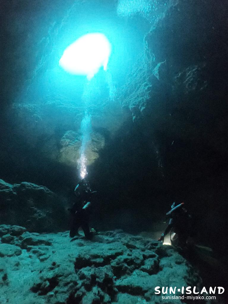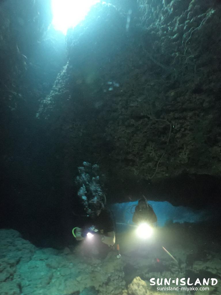 棚を縫うよう通り抜けられる洞窟、水深3mから25mまで直潜降するなんて、普段のダイビングでは、なかなか体験することがありませんね。