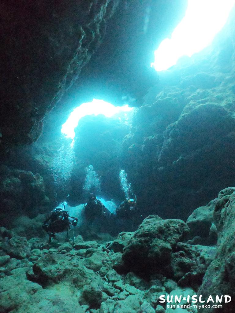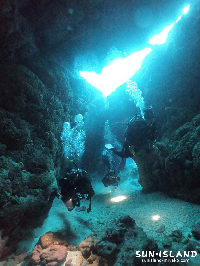 宮古島ダイビングスポット・ポイントは、このような真っ暗又は薄暗い形状の洞窟があるので、水中ライトは必須。