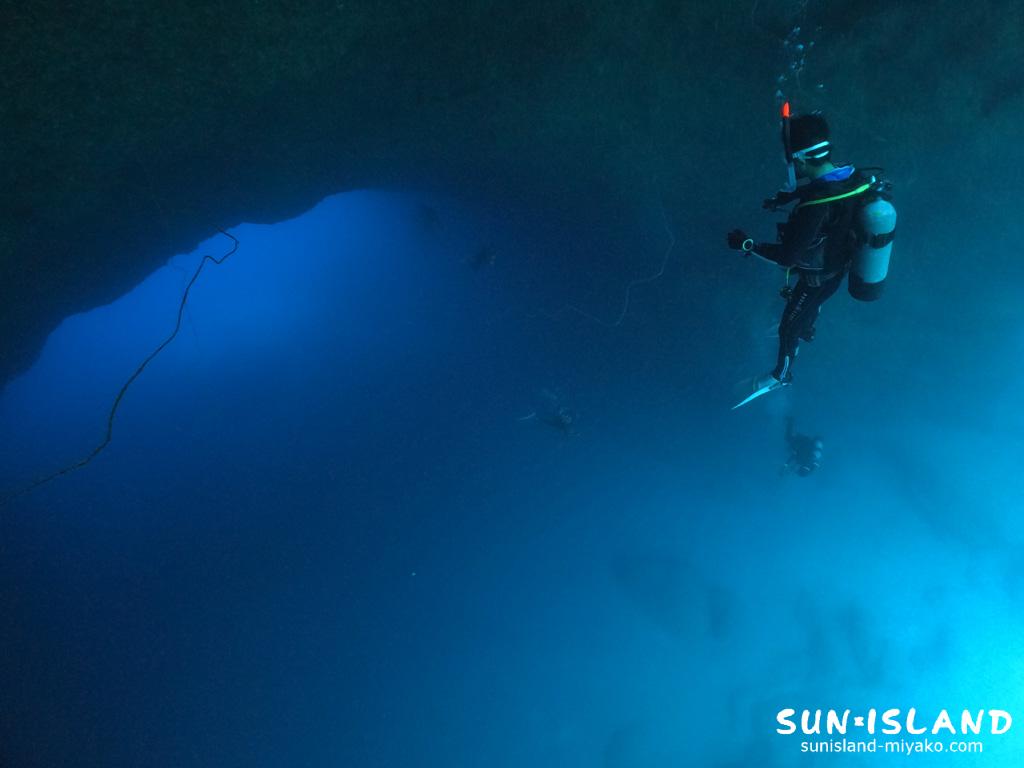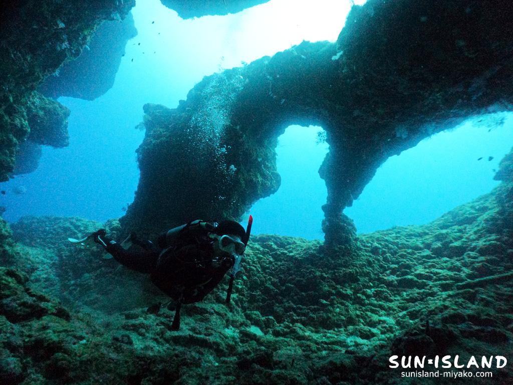 宮古島ダイビングスポットのなかで、最大の大きさを誇るここの穴の前にたつと、ついつい青さ際立つ造形美にこころを奪われれしまうんですよねー。