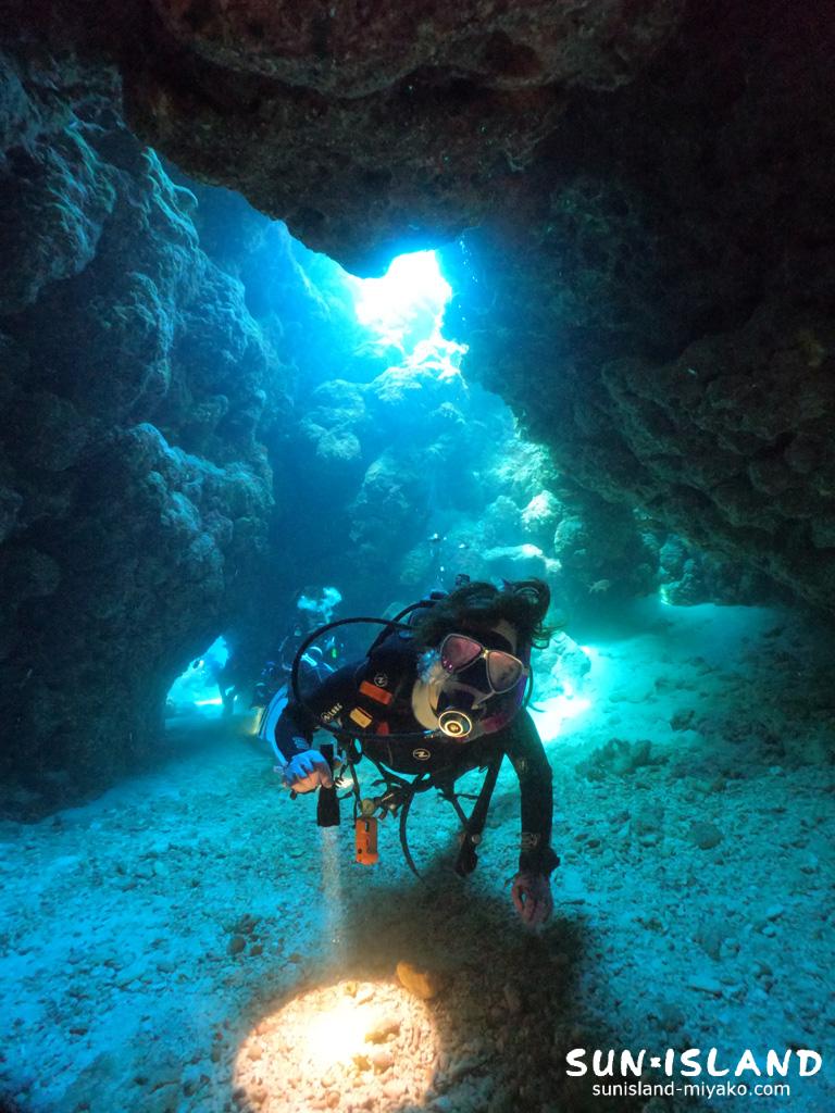 晴れてる日の朝一番に潜ると、その小さな穴からスポットライトのような光が洞窟内を照らす。