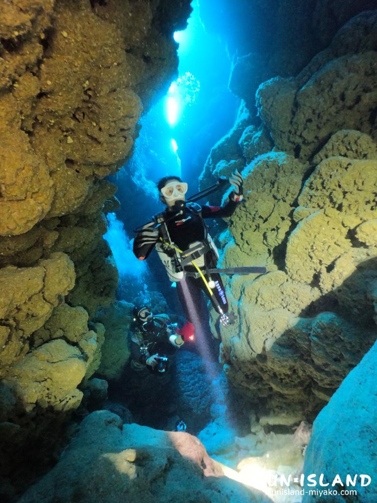 移動中、波やうねりで船は揺れましたが、南岸エリアへゆくと穏やかで且つ透視度20~25mほどあり、また伊良部島・下地島と雰囲気が異なる起伏に富むダイナミックな地形ダイビングを満喫。