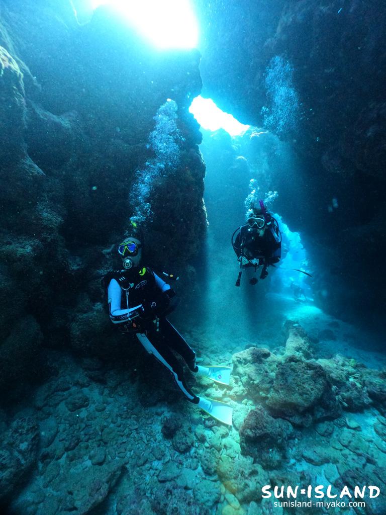 宮古島ダイビング初めての方達やリピーターKさんと、透視度バッグんの下地島の地形ポイントで穴の造形を楽しみました。