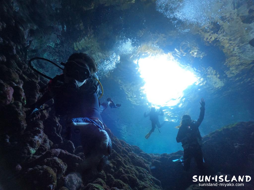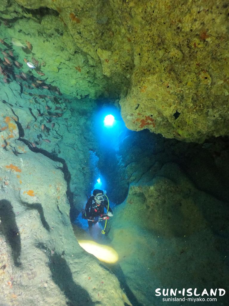 頭上の穴から時折光の差し込みがあり、陰影が幻想的。水中ライトをあてるとアカマツカサ・ミナミハタンポ・リュウキュウハタンポが一斉に泳ぎまわりそのシーンは圧巻でした。